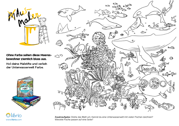 Plitsch, platsch: Mit der nächsten Malvorlage geht es unter Wasser! Dieses detailreiche Ausmalbild stammt aus unserem Weltreise-Wimmelbuch und zeigt Tiere des Meeres.