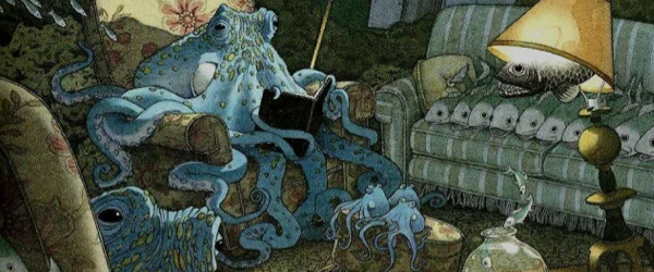 Unter Wasser wartet eine skurrile Welt von Meeresbewohnern. Da gibt es viel zu entdecken – etwa einen Oktopus, der im dämmrigen Licht aus einem Buch vorliest.