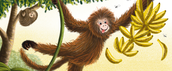 Ferdinand, auf seinem Ast, passt auf, damit er nichts verpasst. So entgeht ihm auch der Affe Ali nicht, der sich durch den Urwald schwingt und Bananen und Mücken vertilgt.