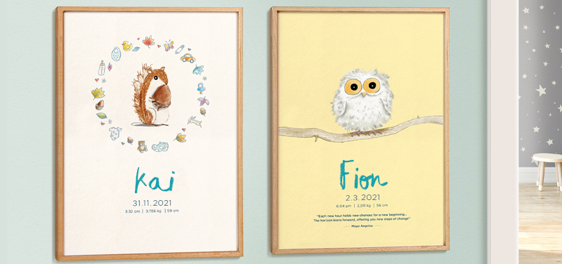Ist der perfekte Name für das Kind einmal gefunden, kann gefeiert werden. Eine besondere Art einen Vornamen zu verewigen sind unsere Geburtsposter. Wählt aus zauberhaften Motiven aus und fügt ein Zitat hinzu, welches das Kind ein Leben lang begleiten wird. Die Poster sind eine zauberhafte Dekoration für jedes Kinderzimmer.
