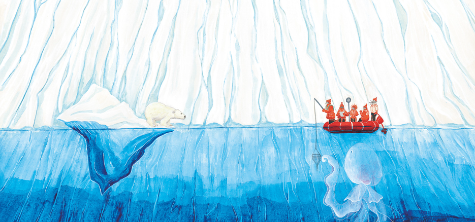 On occasion, you’ll pick up a book and be able to tell as soon as you open it that you are holding something special in your hands. In this blog article, we’d like to introduce you to one such picture book: “The search for the giant arctic jellyfish”. Chloe Savage’s book creates a magical atmosphere from the very first page. Even the front cover is enticing: the illustrations of the Arctic Circle, the crew and the equipment arranged by color immediately captivated us – and the story hadn’t even begun.