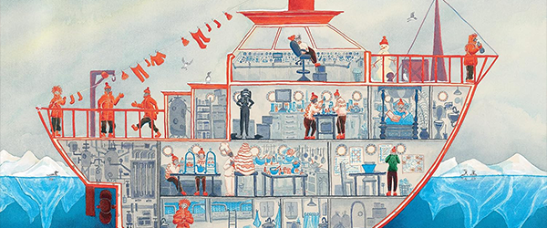 The illustrations are beautiful and have a peculiar charm. Our favorite picture, which reminds us a little of “Balea” by Kalandraka Verlag, shows the everyday life of the researchers and the interior of the ship.