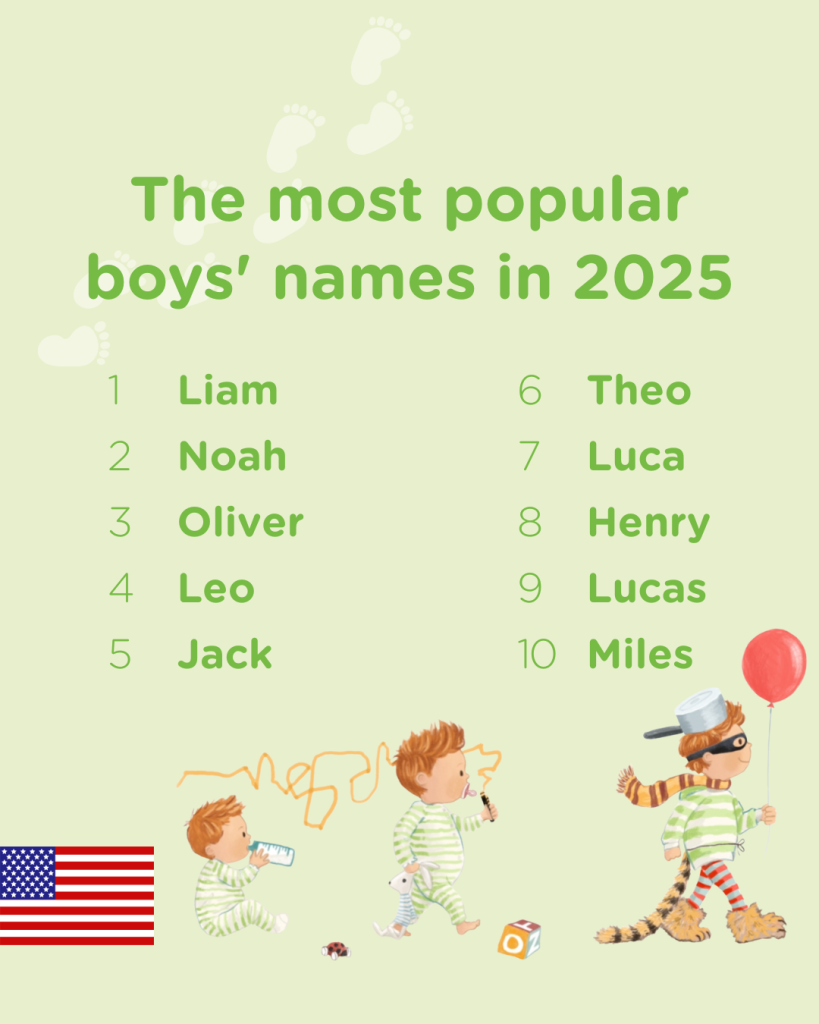 For the boys, Liam is the undisputed champion of 2025. He is followed by Noah and Oliver. A clear trend in the US is names ending in distinct sounds like Leo, Theo, and Luca, while sturdy classics like Jack and Henry round out the list nicely.