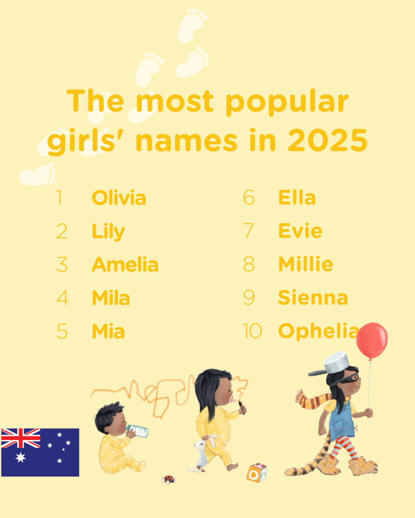 For the girls, Olivia makes it a hat-trick – she is number 1 in Australia as well! However, we see some beautiful distinct entries here, like Ophelia making it into the top 10, and Evie showing the Aussie love for names ending in vowels.
